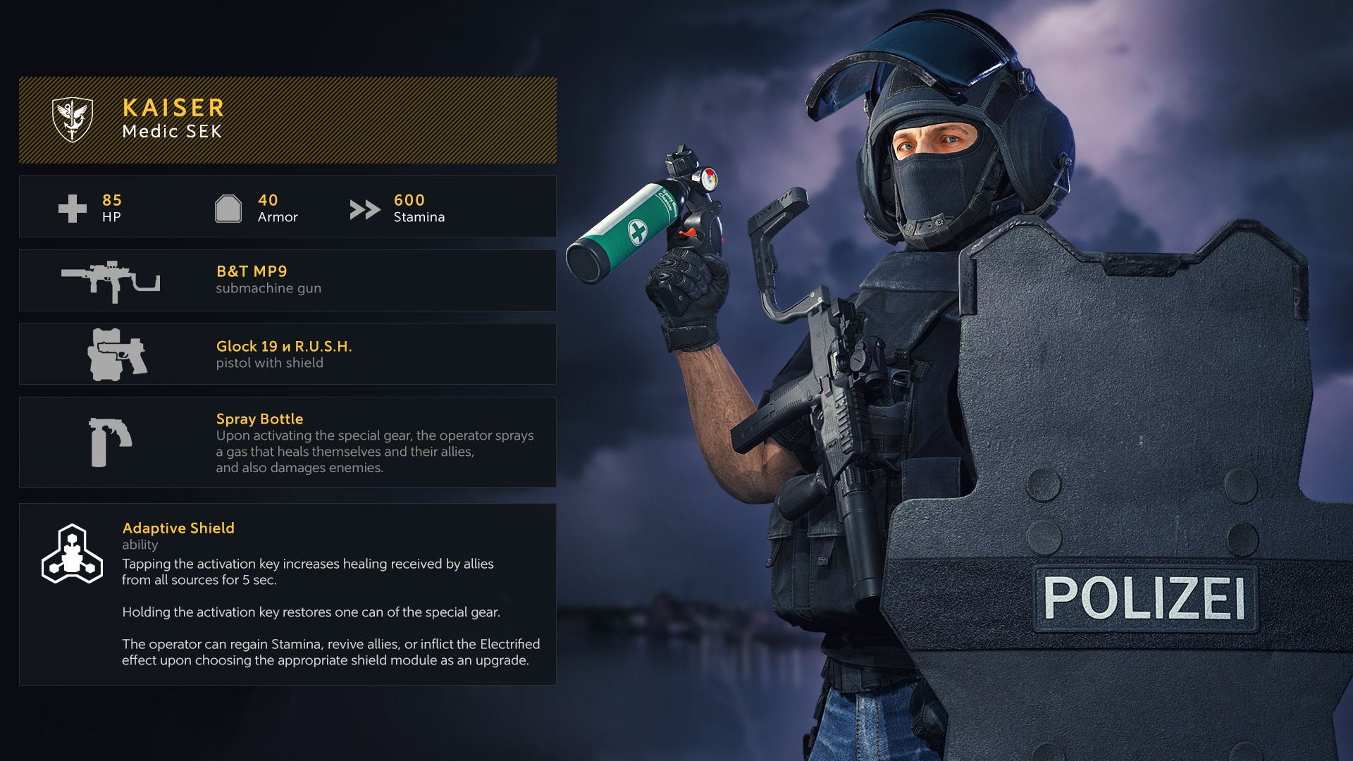 Kaiser is a Medic with an aggressive playstyle: he is able to absorb incoming damage, cover his allies, and work effectively at close range. The closer his teammates are to him, the less damage Kaiser receives. Also, his spray bottle works both ways: it can heal allies and hurt enemies.