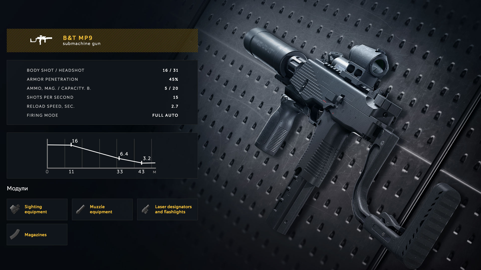 A tested solution for close-quarters combat: high rate of fire and perfect mobility. While using MP9, the R.U.S.H shield cannot be used.