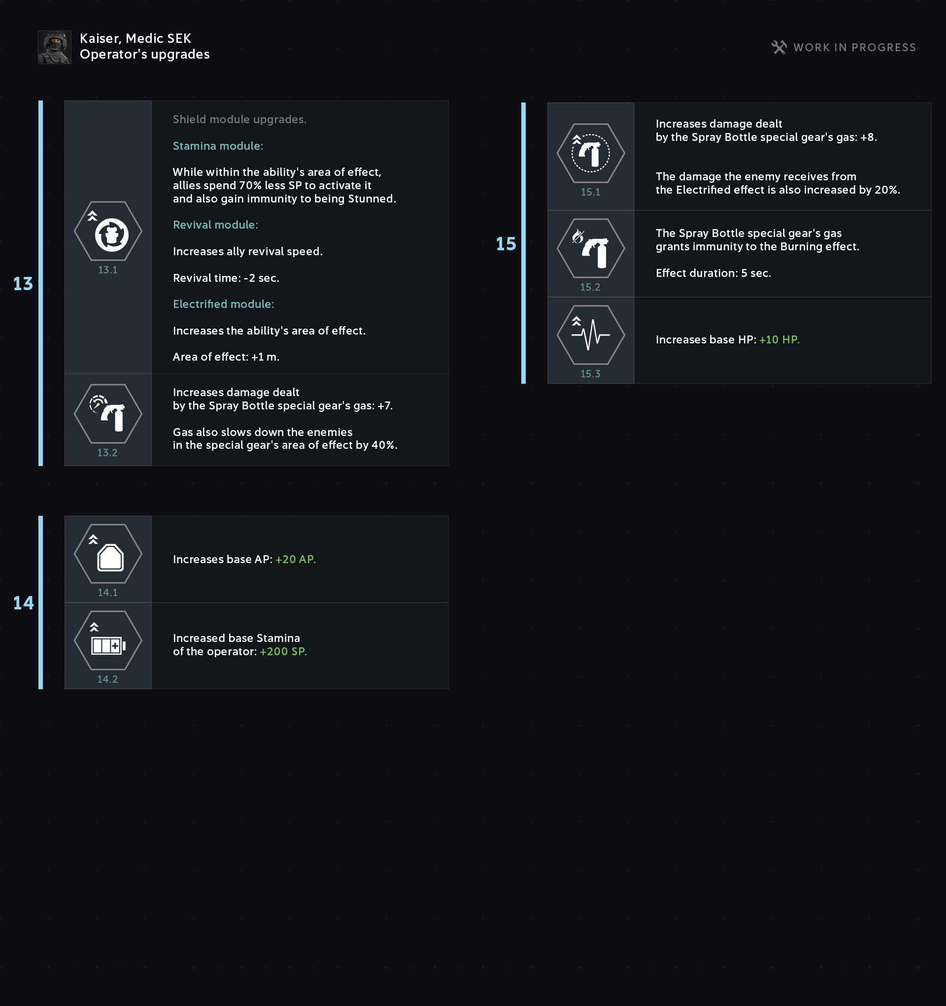 Kaiser’s upgrades include both development of the operator (movement speed increase, special trait bonus, received damage decrease, etc.) and modifications of his equipment.