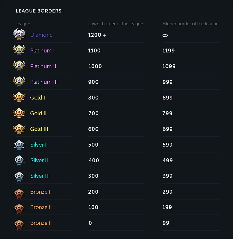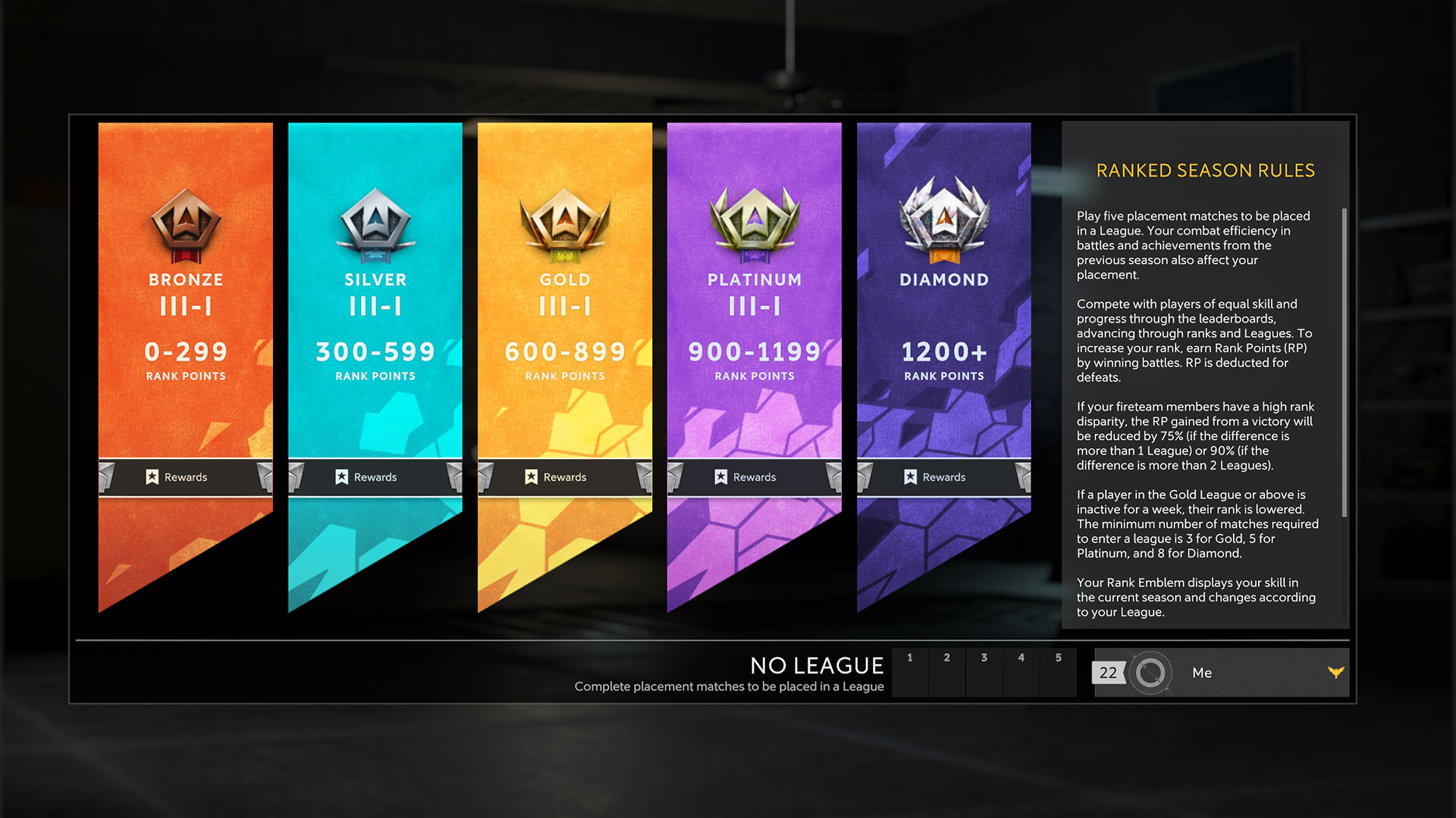 Your starting League will be decided by the results of the placement matches—your first five battles at the beginning of the Season. Your further advancement depends on your performance in battles: victories bring you Rank Points, while losses deduct them.