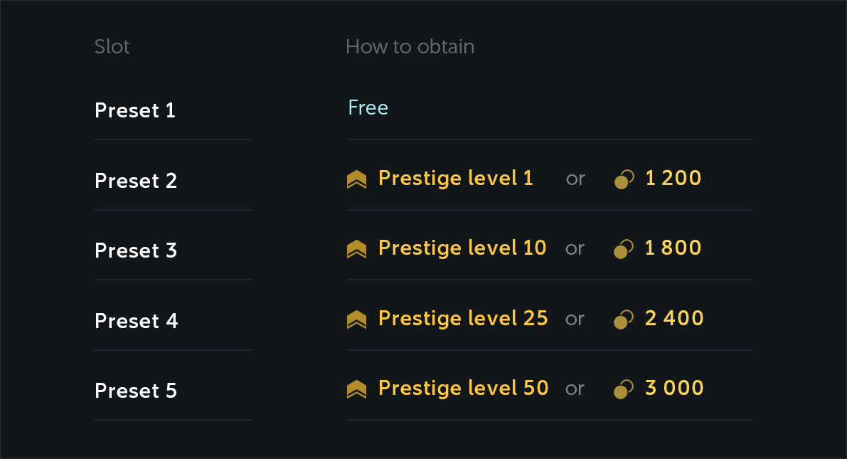 Initially, each operator has only one preset slot. Extra slots can be unlocked with Prestige leveling up or purchased with Coins.