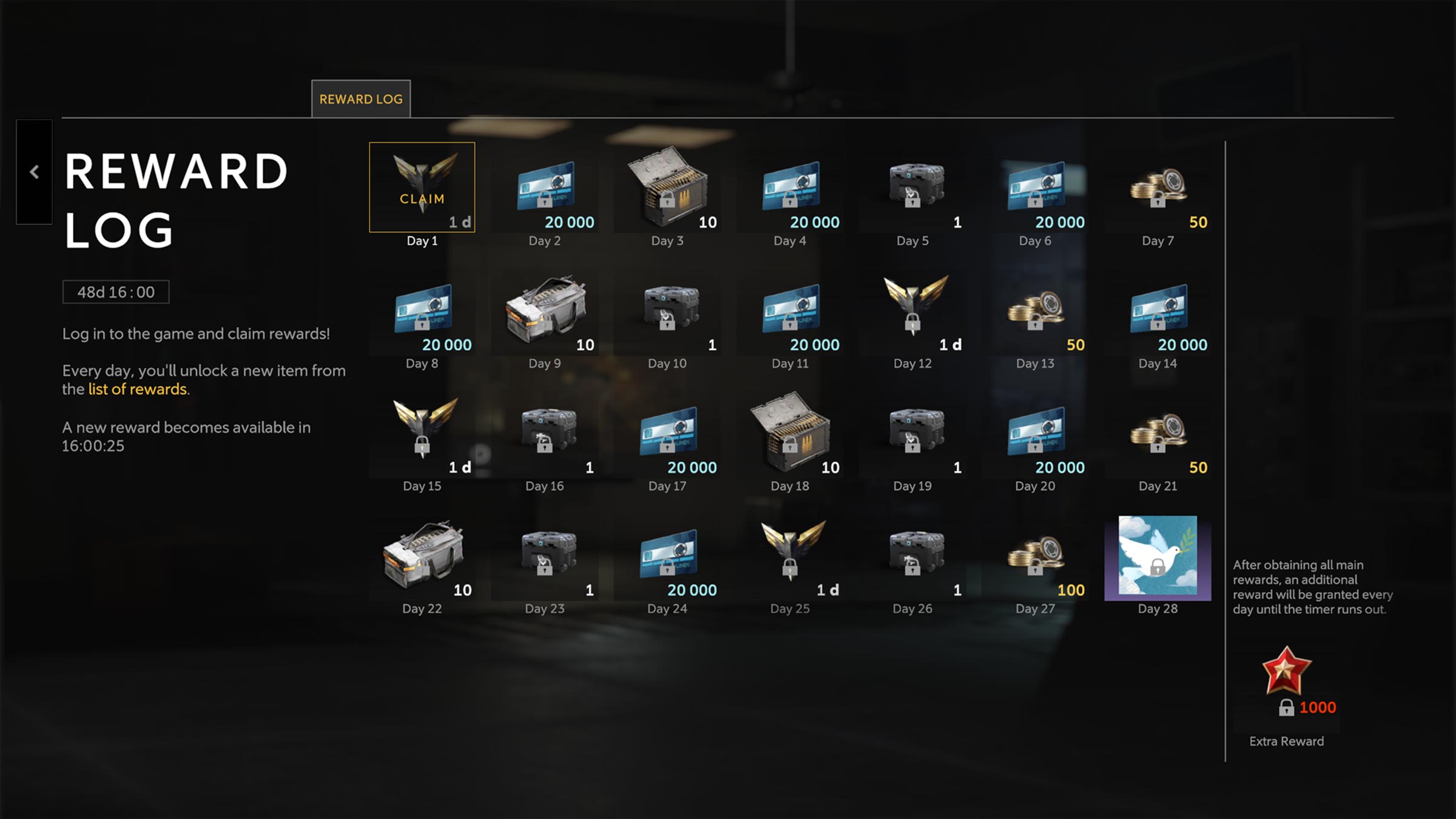 Please note that each new day in Caliber begins at 8 AM UTC. To get all rewards, you have to log into the game every day while the Reward Log is active.