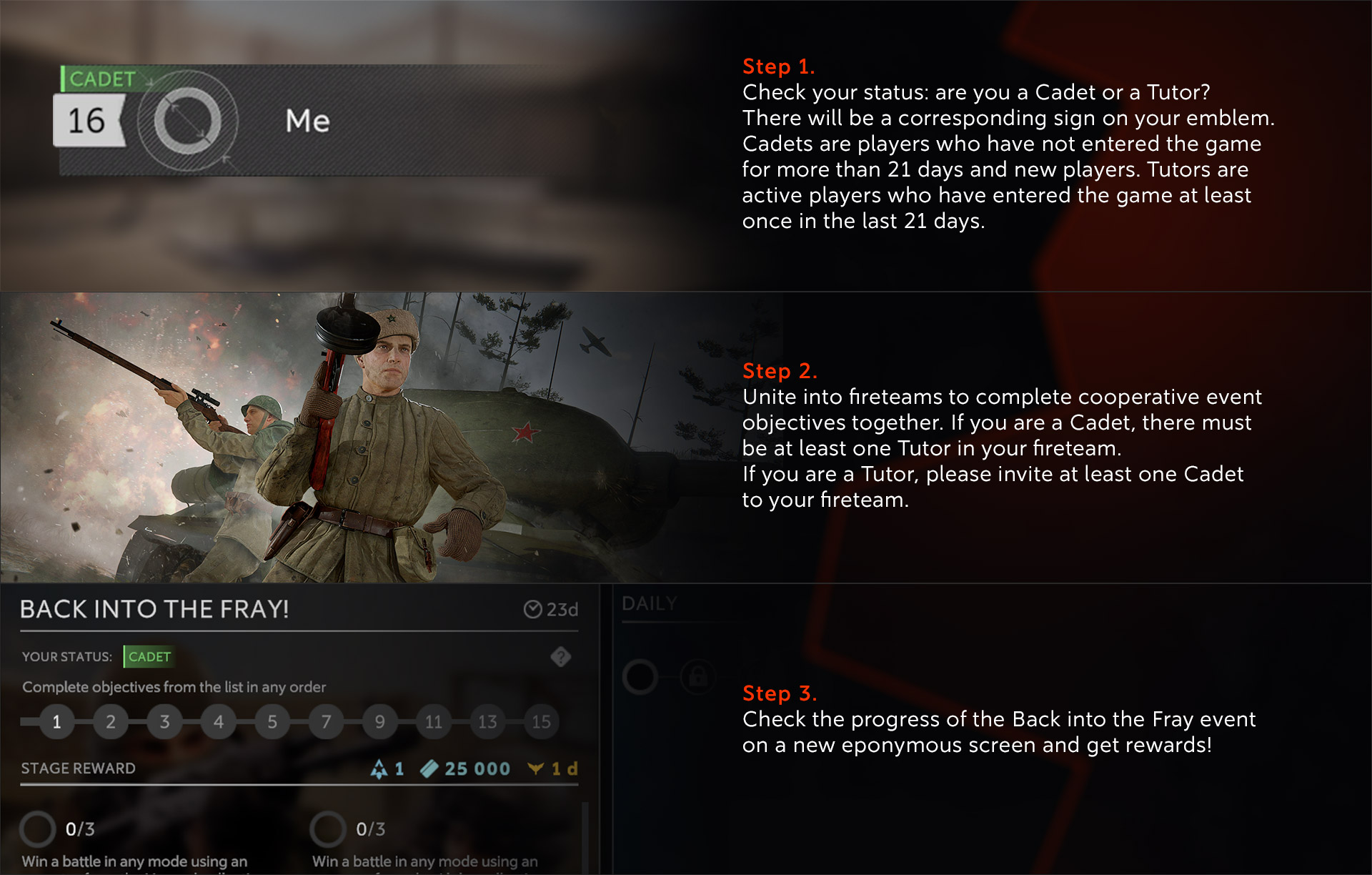 Assemble a fireteam of Cadets and Tutors, complete objectives, and get rewards.