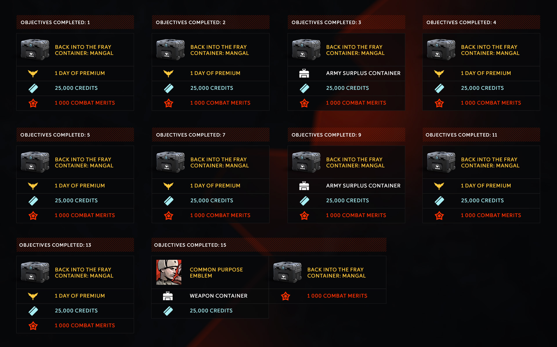 You can get Credits, Premium, Containers with a new Camo, and a lot of Combat Merits.