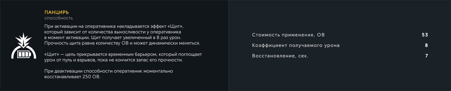 Проще говоря, весь входящий урон сначала расходует выносливость, а не броню или здоровье. «Щит» действует до тех пор, пока запас выносливости не исчерпается или пока не прекратится действие способности.