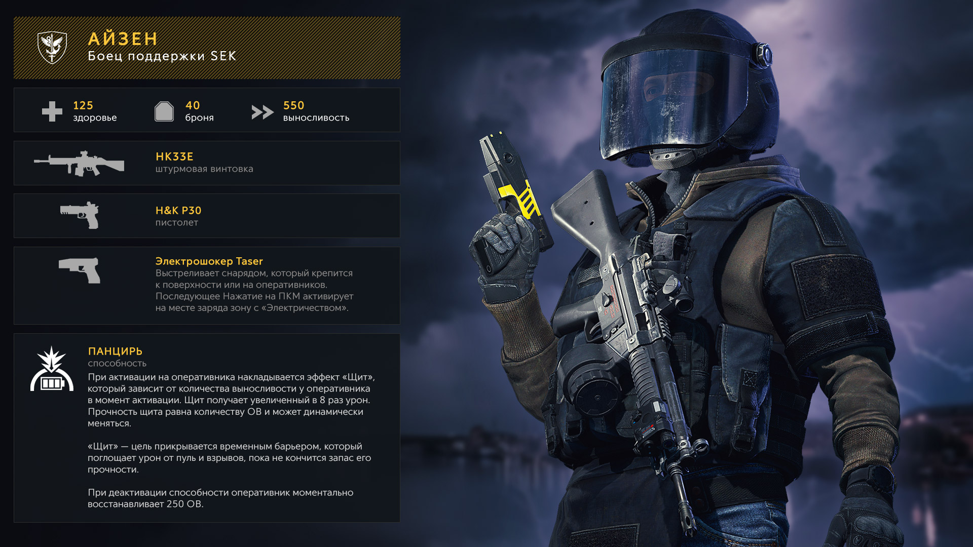 Айзен — настоящая крепость на поле боя. Его задача — принимать удар на себя, прикрывать союзников и уверенно вести команду вперёд. Этот оперативник максимально эффективен в связке с отрядом и раскрывает свой потенциал, находясь рядом с союзниками-игроками.