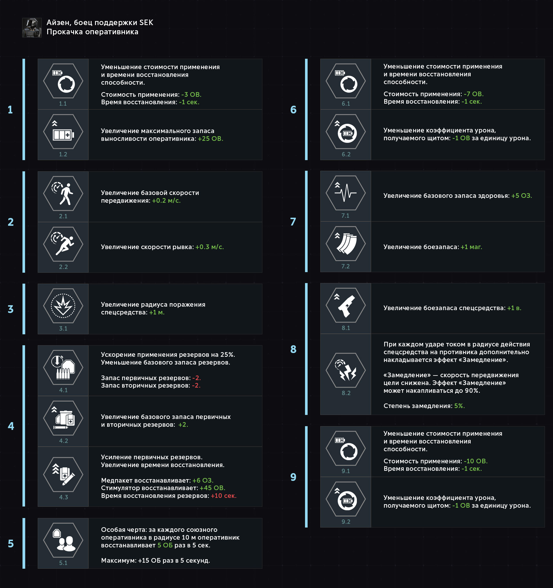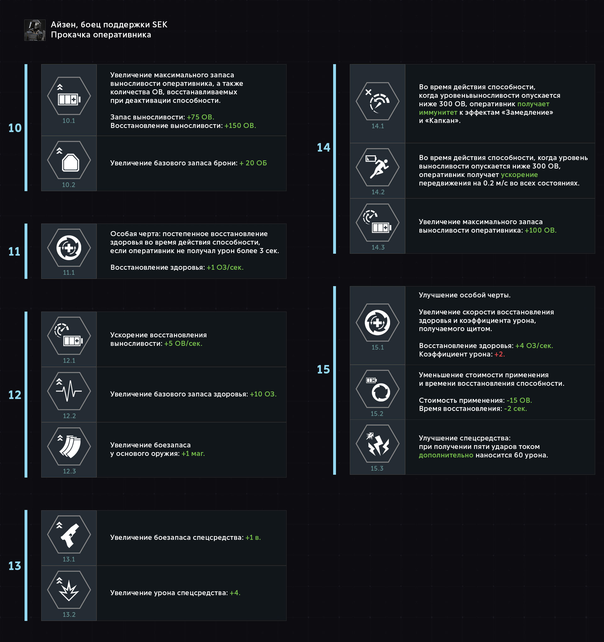 Помимо усиления способности и спецсредства, Айзен получает и другие бонусы: можно увеличить запас здоровья, выносливости и брони, повысить скорость передвижения или рывка, усилить боевые резервы, а также открыть несколько дополнительных полезных улучшений.