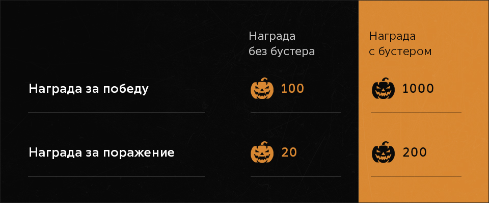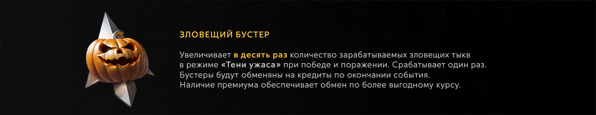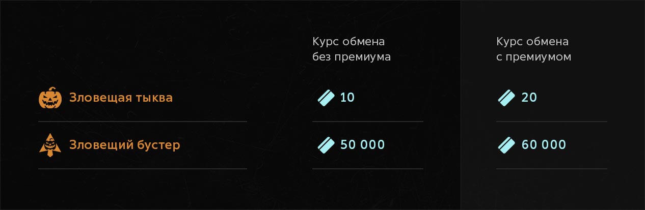 По завершении события все неиспользованные «Зловещие бустеры» и «Зловещие тыквы» будут автоматически конвертированы в кредиты по курсу, указанному на изображении ниже.