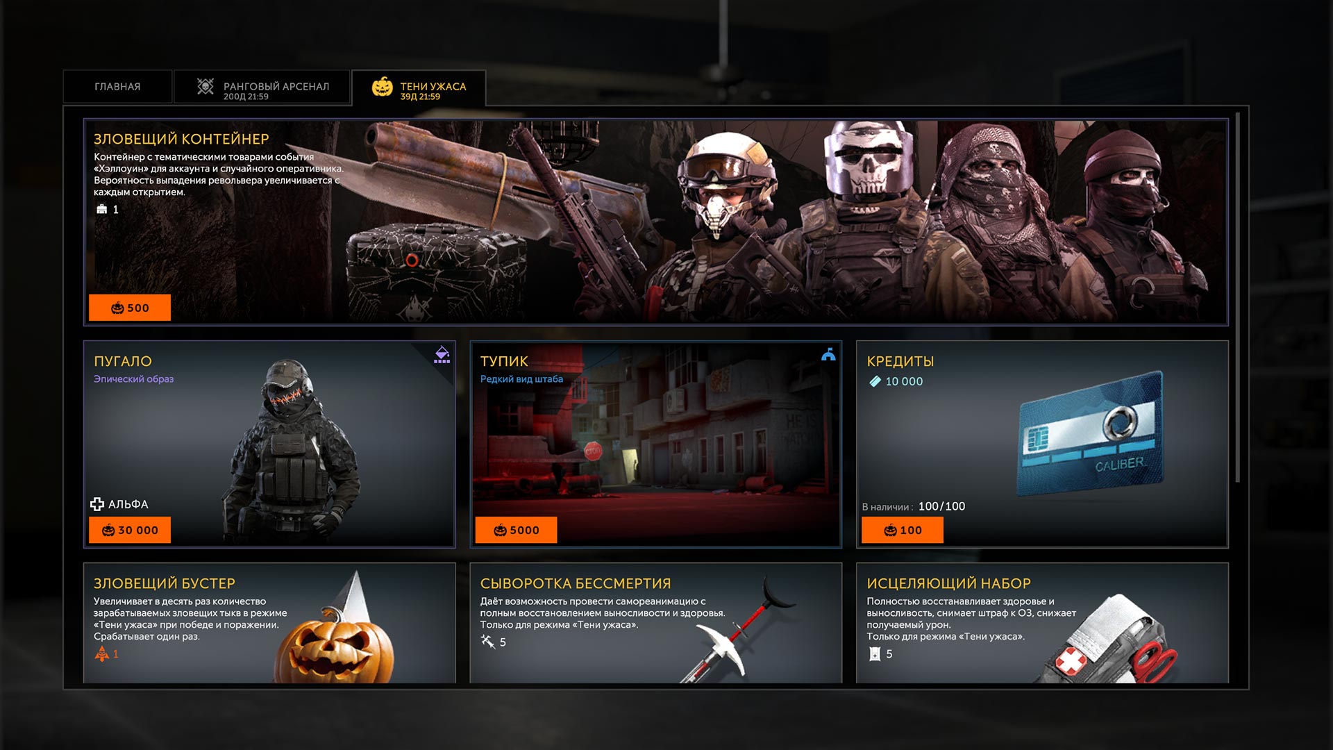 На витрине события вы найдёте всё, что поможет прочувствовать атмосферу Хэллоуина: особые резервы для режима «Натиск: Тени ужаса», «Зловещий бустер», кредиты, эпический образ «Пугало» для медика Травника, фон штаба «Тупик», а также «Зловещий контейнер».