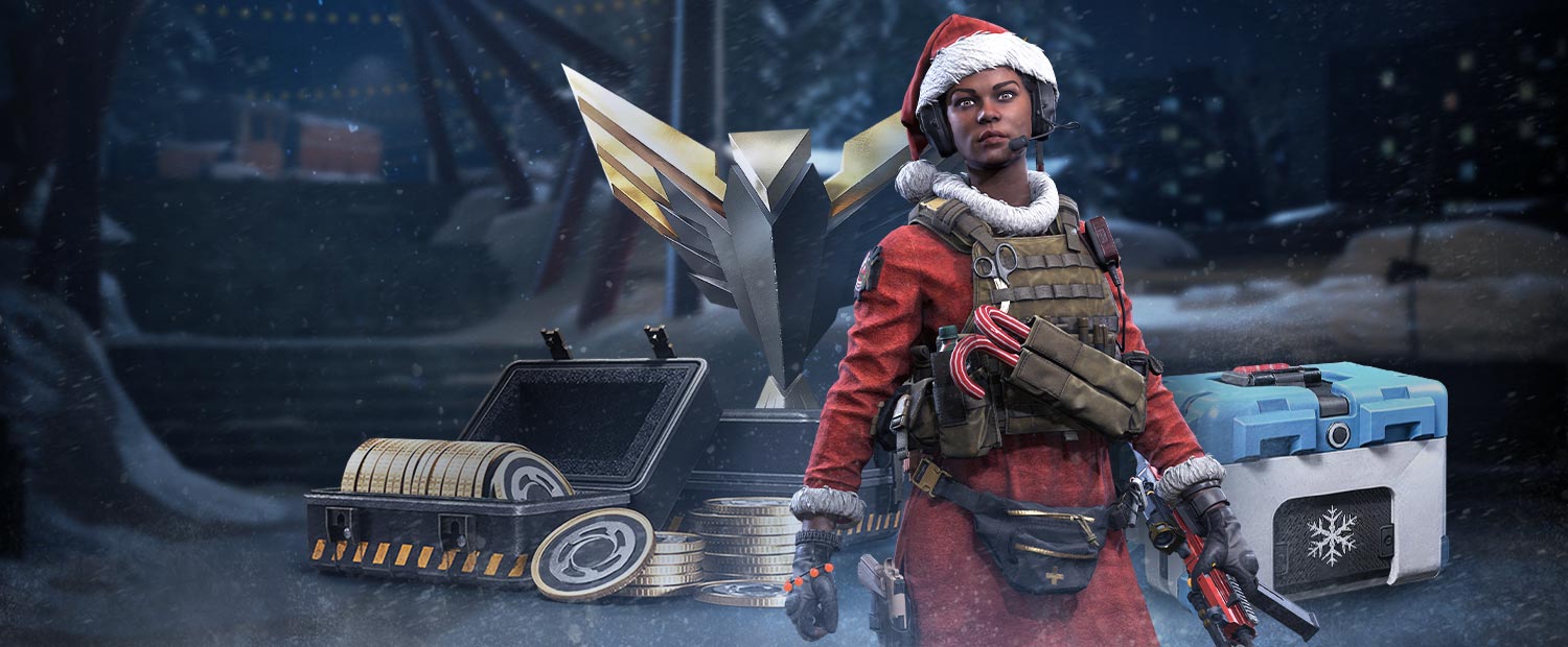 Волшебный набор с эпическим образом «Мисс Рождество» для медика Боунс (а также для Бадди!), атмосферным фоном штаба «Зимний парк», 10 контейнерами «Охота за подарками», 5 000 монетами, 7 днями премиума и, конечно же, самой Боунс.