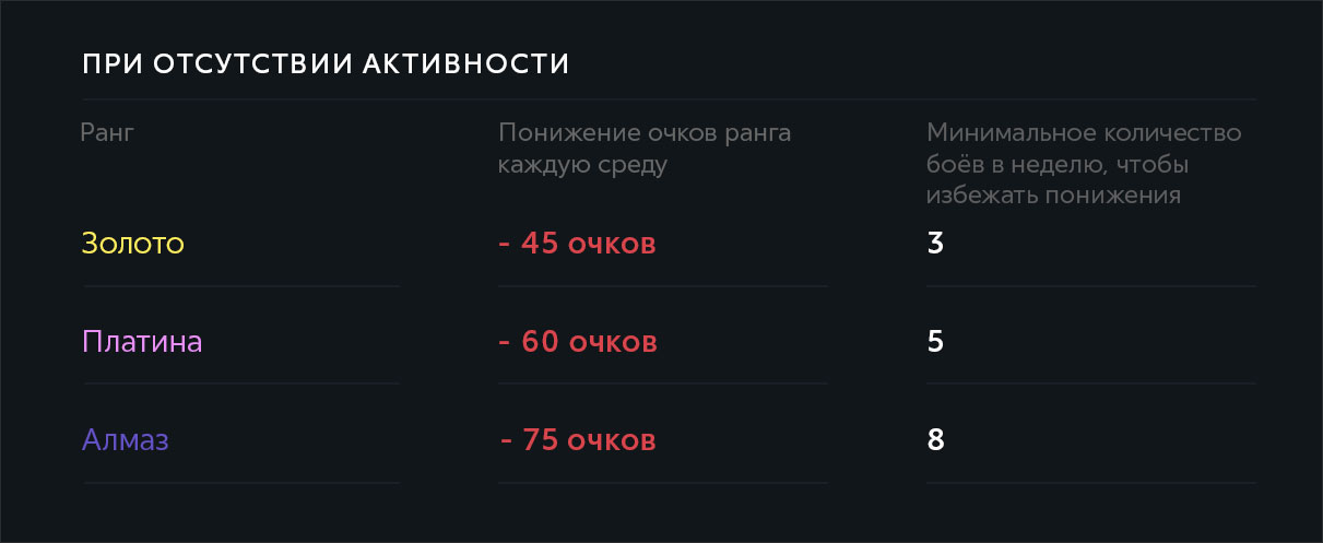 В лигах от «Золота» и выше за отсутствие активности каждую среду будет снижаться рейтинг. Чтобы этого избежать, нужно каждую неделю сыграть определённое количество боёв в ранговом режиме.