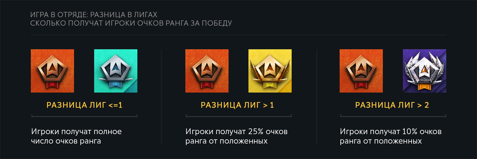 Если вы играете в отряде, где участники находятся в разных лигах, подбор противников учитывает игроков с наивысшими лигами вашего отряда. Победа в таком бою принесёт меньше очков ранга.