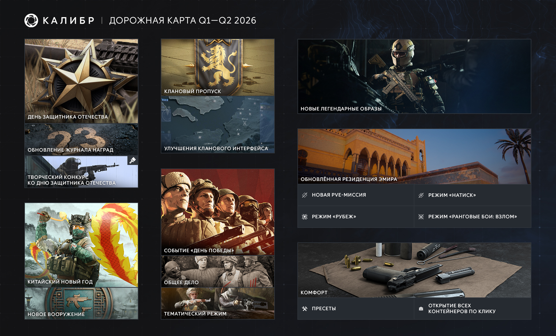 Показываем, что готовим для вас в первой половине 2026 года. Впереди — традиционные тематические события и награды, первый клановый пропуск, а также большое обновление карты «Резиденция Эмира».